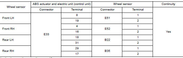 NO >> Replace the wheel sensor. Refer to BRC "FRONT WHEEL SENSOR : Removal and Installation" (front) or BRC "REAR WHEEL SENSOR : Removal and Installation" (rear).