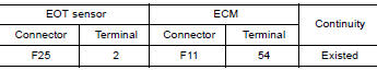 | P0197 | EOT SEN/CIRC (Engine oil temperature sensor circuit low input) | An excessively low voltage from the engine oil temperature sensor is sent to ECM. |