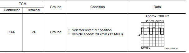 under the following diagnosis conditions: - Diagnosis conditions - Selector lever: "D", "L" or "R" position - Auxiliary gearbox shifting is not in progress. - When the "D" position switch, "L" position switch or "R" position switch is ON, the output speed has not experienced 250 rpm or more. - After shifting the selector lever, the input speed has experienced less than 300 rpm. - Secondary pulley speed: 1,500 rpm or more - TCM power supply voltage: More than 11 V |