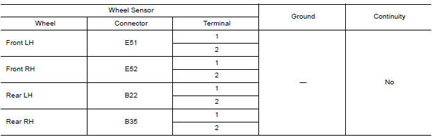 Check continuity between wheel sensor connector terminals and ground of wheel