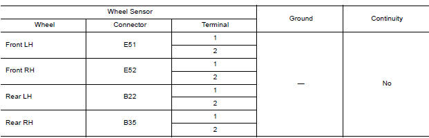 Check continuity between wheel sensor connector terminals and ground of wheel