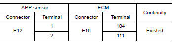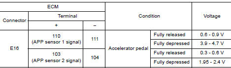 | P2138 | Accelerator pedal position sensor circuit range/performance | Rationally incorrect voltage is sent to ECM compared with the signals from APP sensor 1 and APP sensor 2. |