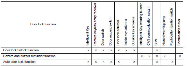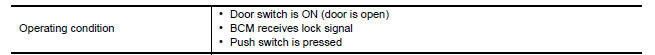 For the operation check, BCM blinks hazard warning lamps (lock: 1 time, unlock: 2 times) and sounds Intelligent Key warning buzzer (lock: 1 time, unlock: 2 times) when door lock or unlock operates by operation of each door request switch.