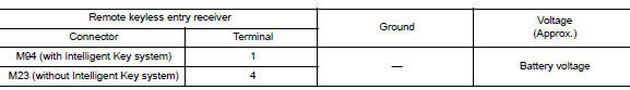 Check voltage between remote keyless entry receiver connector and ground.