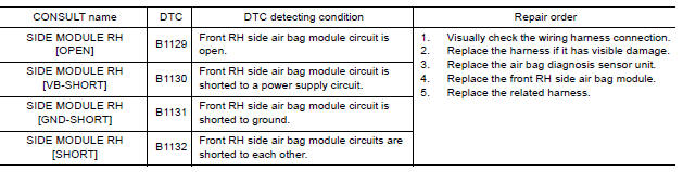 DTC B1129 - B1132 FRONT RH SIDE AIR BAG MODULE