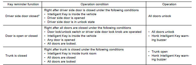 NOTE: The above function operates when the Intelligent Key is inside the vehicle. However, there may be times when the Intelligent Key cannot be detected, and this function does not operate when the Intelligent Key is on the instrument panel, rear parcel shelf, or in the glove box. Also, this system sometimes does not operate if the Intelligent Key is in the door pocket for the open door.