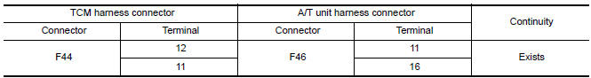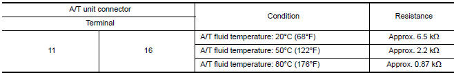 Check the fluid temperature sensor. Refer to TM, "Component Inspection (A/T Fluid Temperature Sensor)".