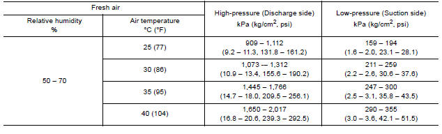 Diagnose using a manifold gauge whenever system's high and/or low side pressure(s) is/are unusual. The marker above the gauge scale in the following tables indicates the standard (usual) pressure range. Refer to Ambient air temperature-to-operating pressure table since the standard (usual) pressure, differs from vehicle to vehicle.