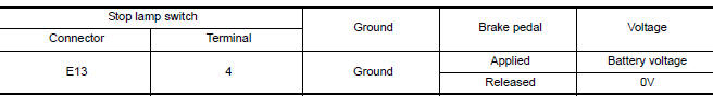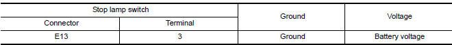 Check voltage between stop lamp switch connector E13 terminal 3 and ground.