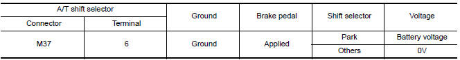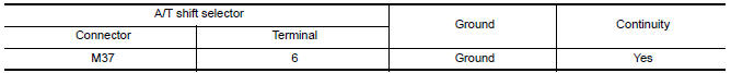 Check voltage between A/T shift selector connector M37 terminal 6 and ground.