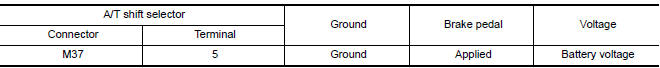 Check voltage between A/T shift selector connector M37 terminal 5 and ground.